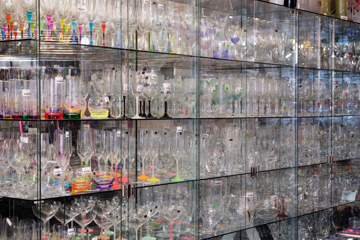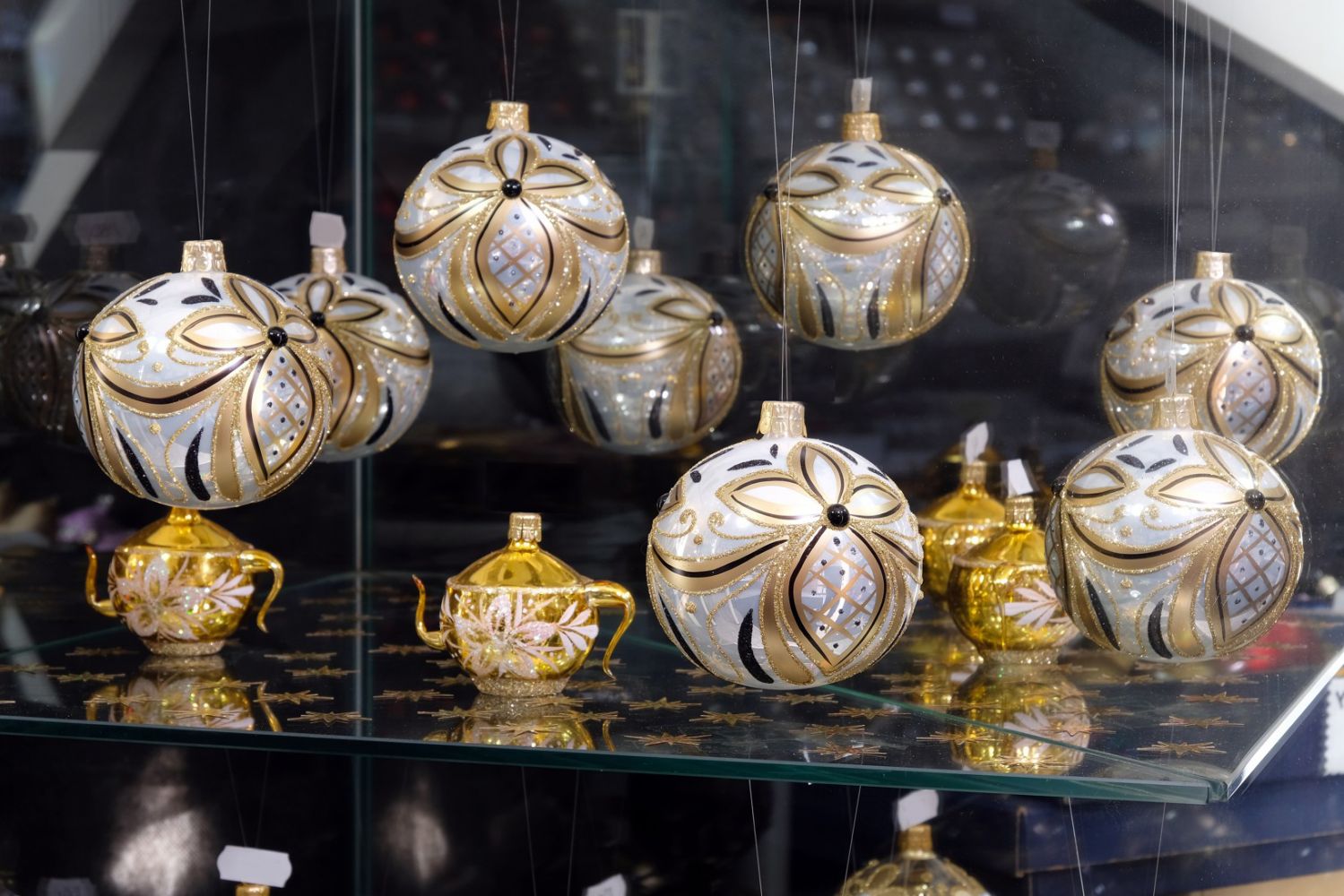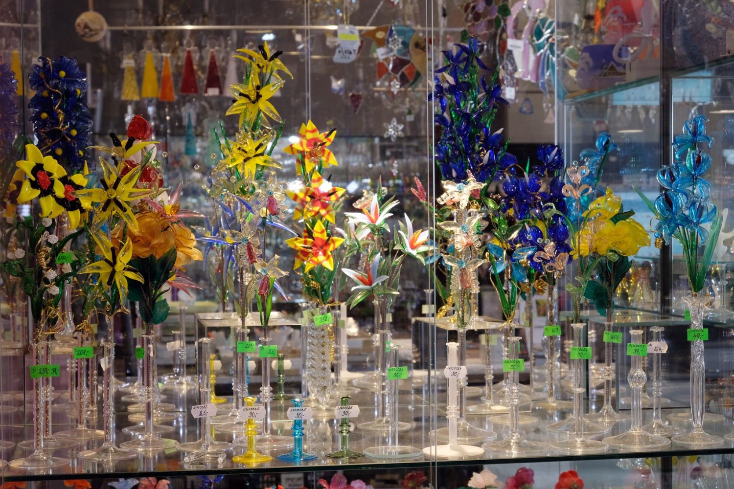 skleněné korálky různých barev a velikostí, skleněné figurky a květiny, nápojové a užitkové sklo, skleněnou a štrasovou bižuterii, vánoční ozdoby,