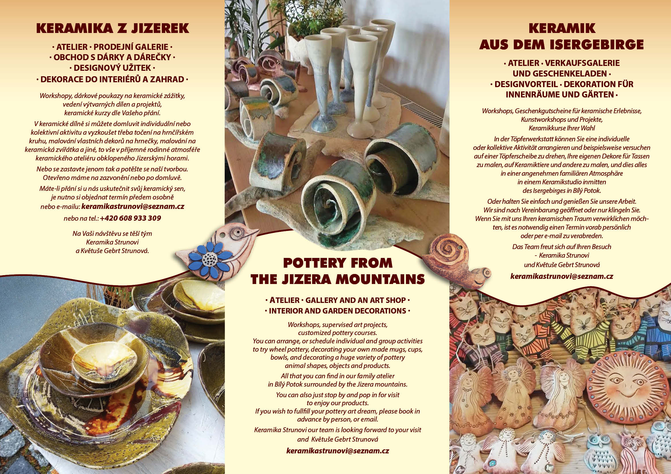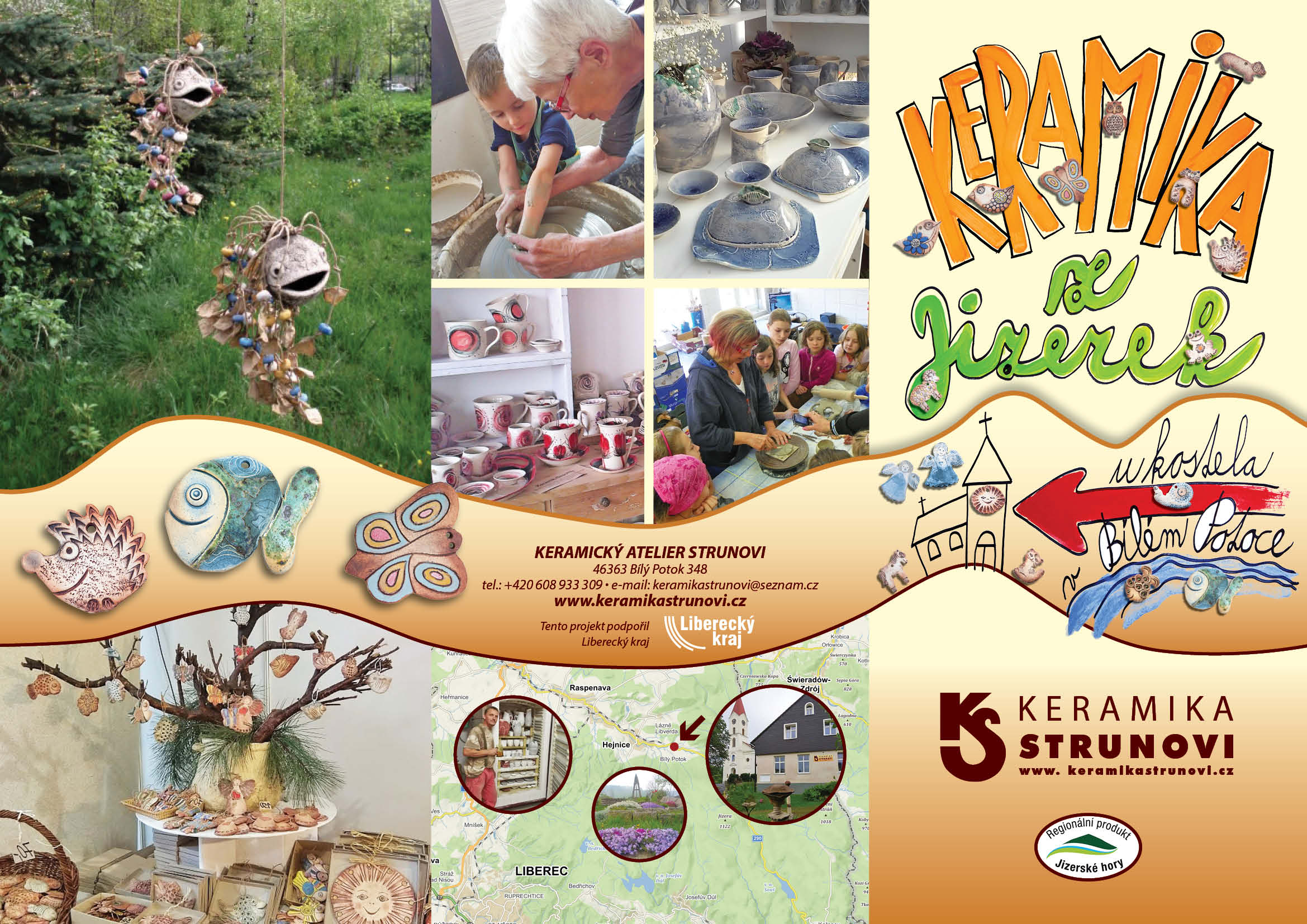 Keramická dílna vznikla v roce 1989 v Liberci. Od roku 2009 máme působiště v Bílém Potoce (u kostela). Keramika je vyráběna jak tradičními a originálními, tak i méně tradičními postupy.