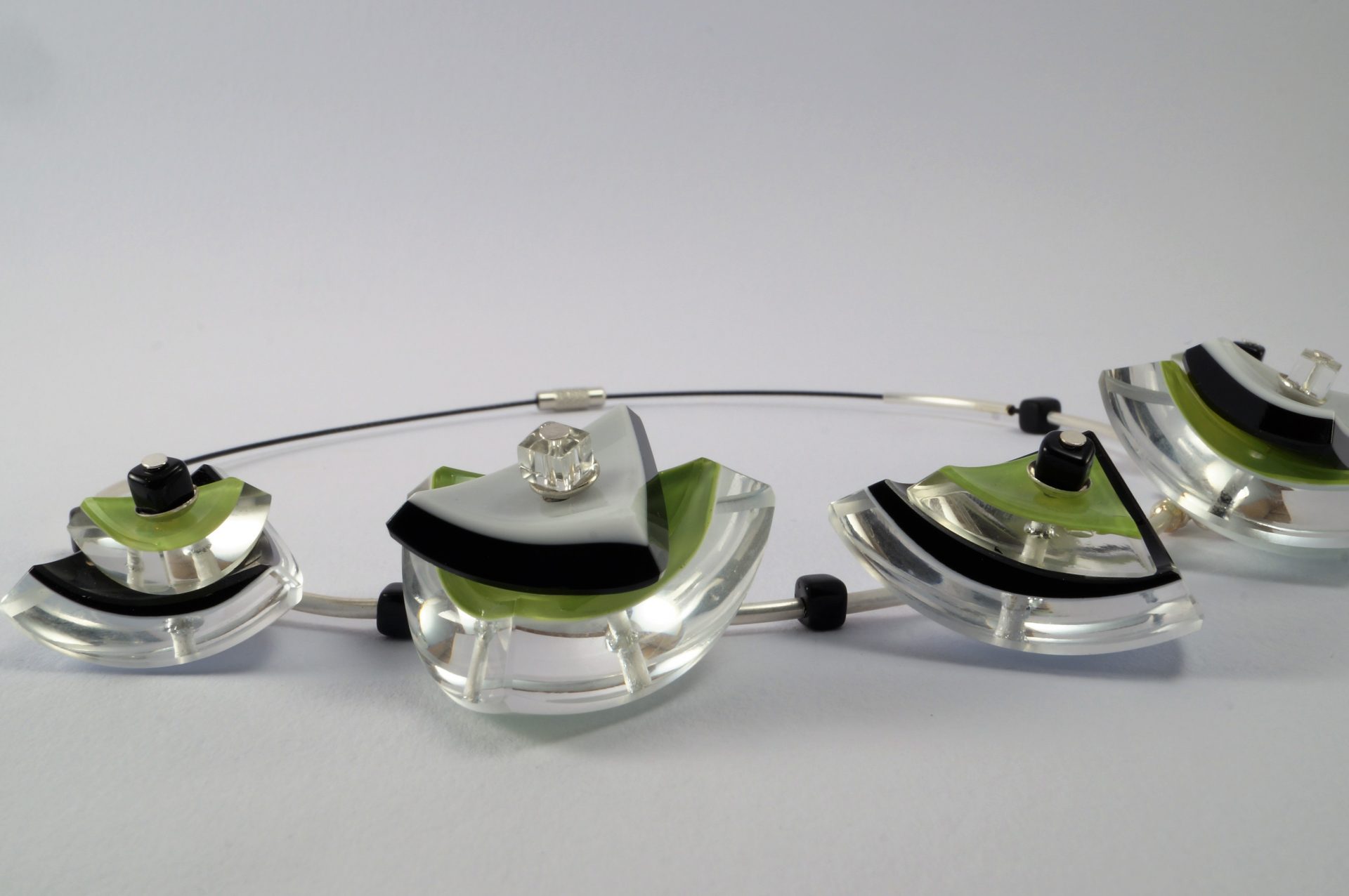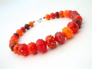 Autorské šperky z hutně tvarovaných, skleněných tyčí: „Hutně tvarované skleněné tyče autorka nejprve rozřeže diamantovou pilou na požadovaný tvar a poté obrousí a vyleští na brousících strojích. Vzniklé moderní a hodně barevné kompozice ze skleněných dílů lepí UV lepidlem a navléká na obojkové dráty.“